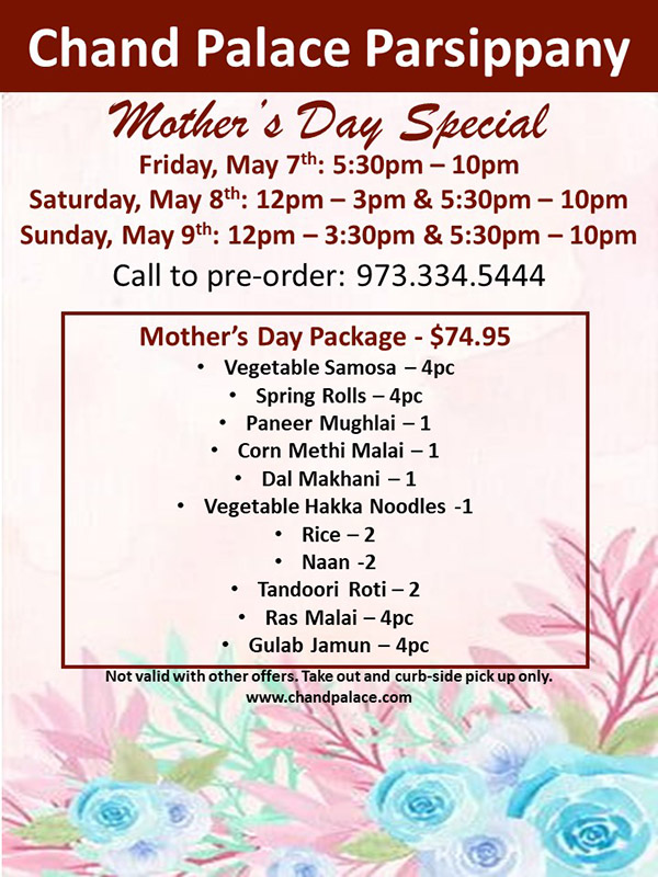 "Enjoy Special Meal with your Mother at Chand Palace on 12th May 2013", Events and news of Chand Palace which serves Indian Food Cuisine and online ordering and free delivery, Multicuisine Menu, A wide variety of Indian Dishes with a wide range of great discounts, catering provider in New Jersey,delicious Indian food, Iddli, Onion Bhajia, Aloo Tikki, 257, Littleton Road 07054, Parsippany, (973) 334-7600